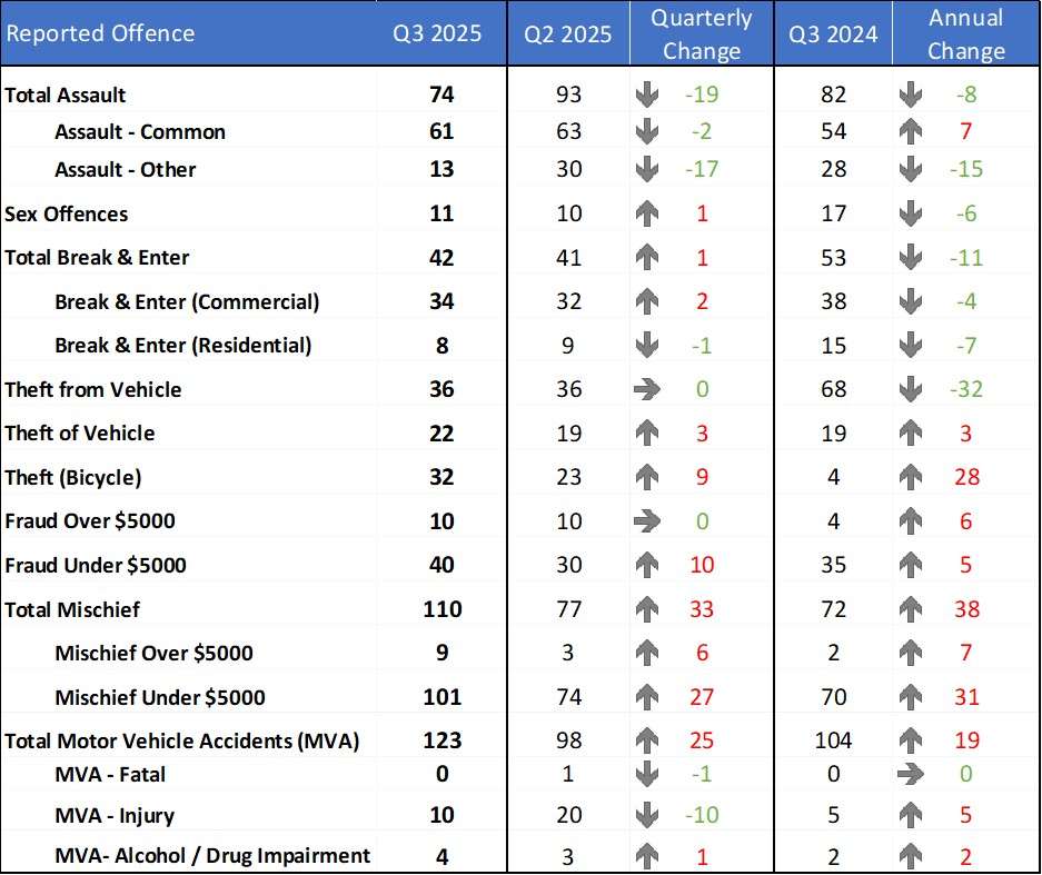 Cranbrook, BC (October 20, 2025) – The Cranbrook RCMP Detachment responded to 3,146 reports to police and 2,624 calls for service during the third quarter of 2025, according to a report presented to City Council by Staff Sergeant Barry Graham on Monday. The figures show an increase from the previous quarter, which saw 2,781 reports and 2,040 calls for service. The update also highlighted a rise in certain property-related offences — including mischief, theft of vehicles, and theft of bicycles — while showing decreases in most persons crimes, such as assaults, as well as a reduction in residential break and enters.