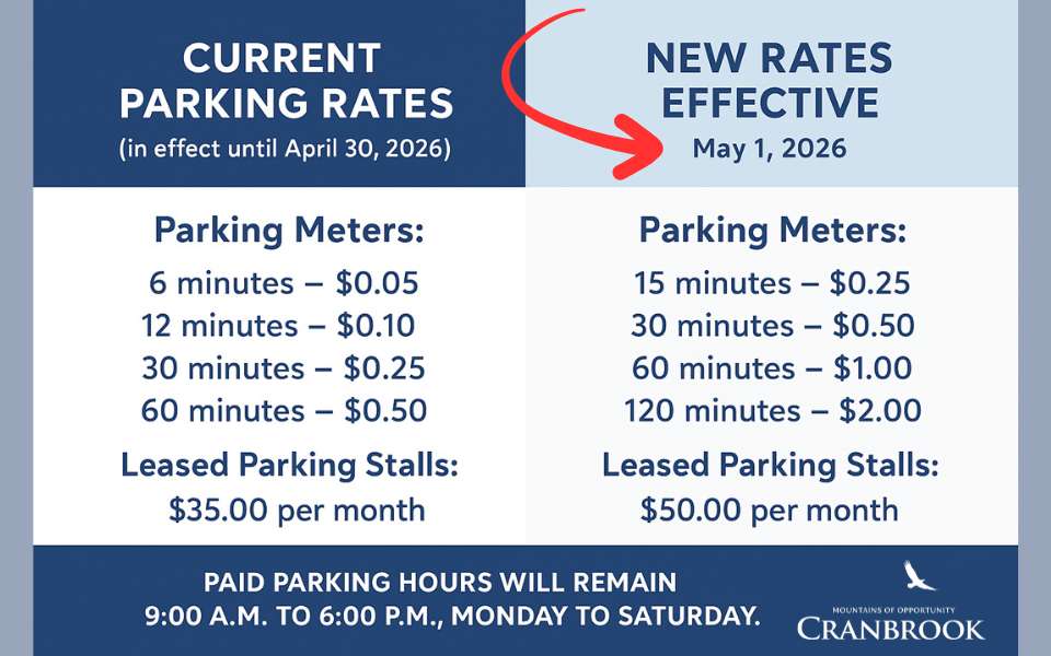Cranbrook, BC (February 17, 2026) – A reminder to residents, downtown business owners and those who work downtown Cranbrook, that parking meter and leased parking stall rates will be increasing starting May 1, 2026, as part of the City’s ongoing efforts to modernize downtown parking and support long-term infrastructure improvements.