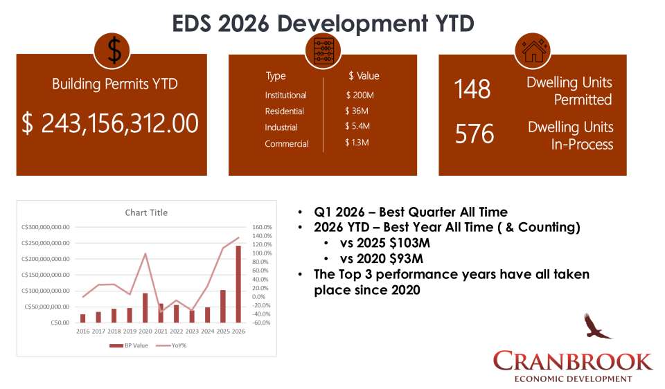 Cranbrook, BC (April 13, 2026) – Cranbrook has recorded its strongest, single-quarter, and single year in building permit activity ever in the City’s history, totaling over $243 million year to date – a truly exceptional milestone. Last year the City had set an all-time record for permit values of just over $100 million for the full year. This year, the City is already almost 2.5 times that number after the first quarter of the year.