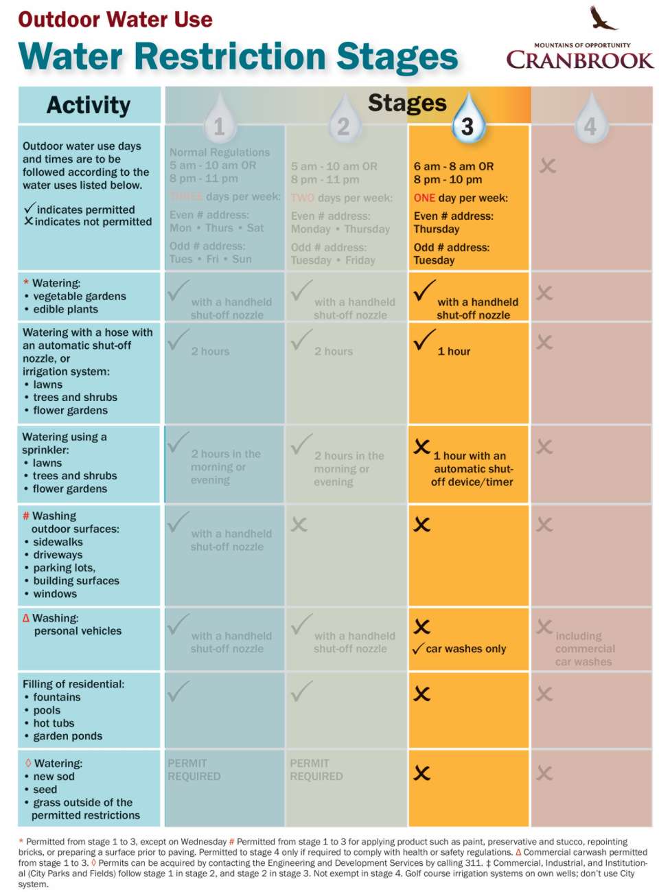 For more information about water conservation, outdoor watering restrictions, tips on saving water indoors and outdoors, visit https://cranbrook.ca/residents/water-conservation.