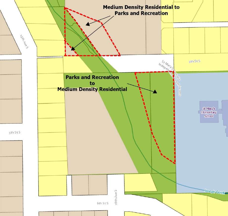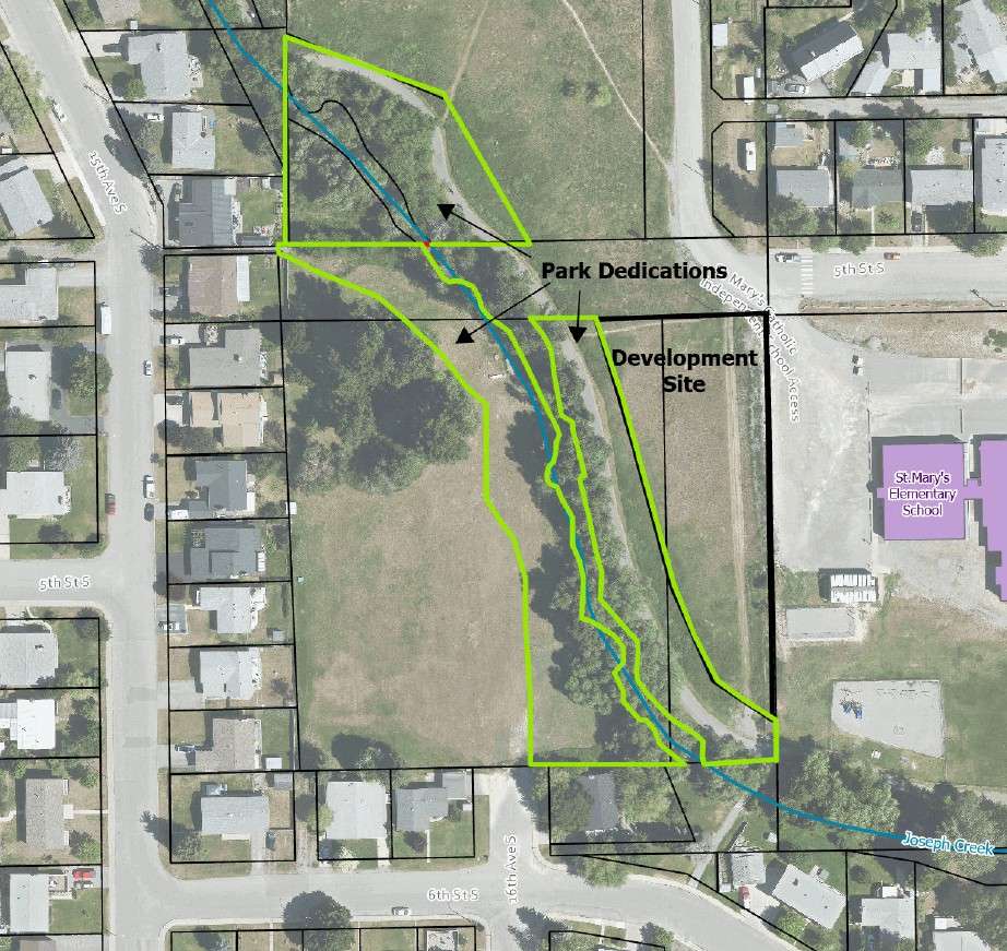 If Council provides approval, the proposed subdivision will designate land on both sides of Joseph Creek adjacent to St. Mary’s School, which includes Rotary Trail, to become a protected park for the community. This dedication would provide legal protection of the riparian area and creek and provide a park connection to Kinsmen Park nearby.