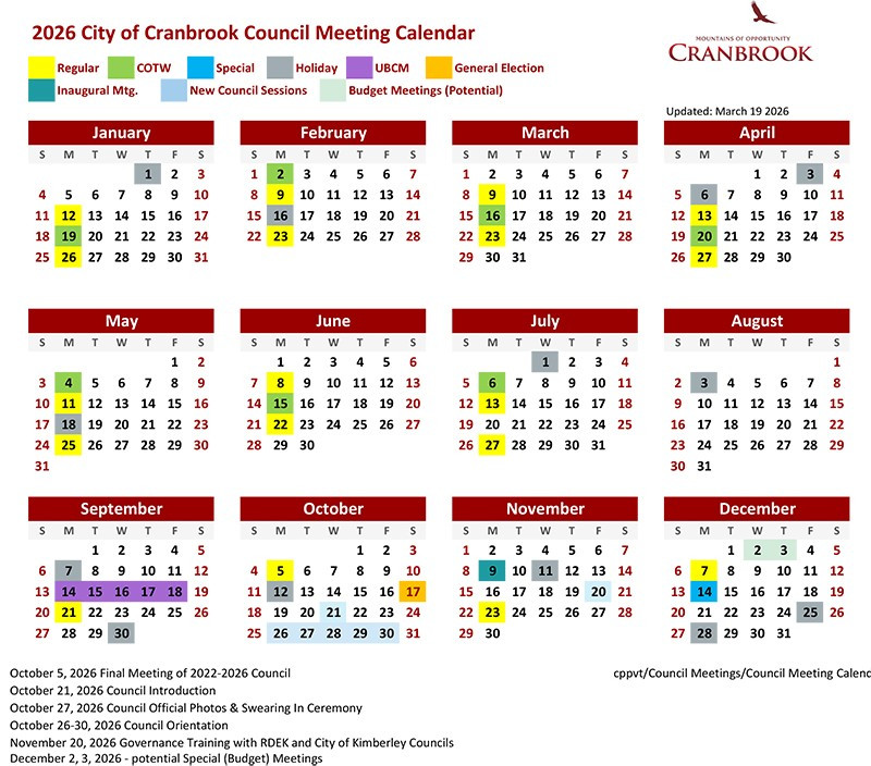 Meetings are held in Council Chambers at City Hall at 40 – 10th Avenue South and can be watched online at www.cranbrook.ca/livestream.