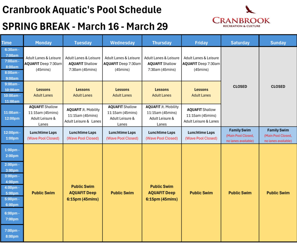 Lunchtime Laps: Come enjoy our main swimming pool for an hour dedicated to lane swimming. Additional lanes will be added to accomodate increased traffic, ensuring plenty of space for swimmers of all paces! Whether you're looking for a quick workout or a refreshing break, Lunchtime laps is the perfecrt way to energize your afternoon. Please note: the wave pool is closed during Lunchtime Laps.