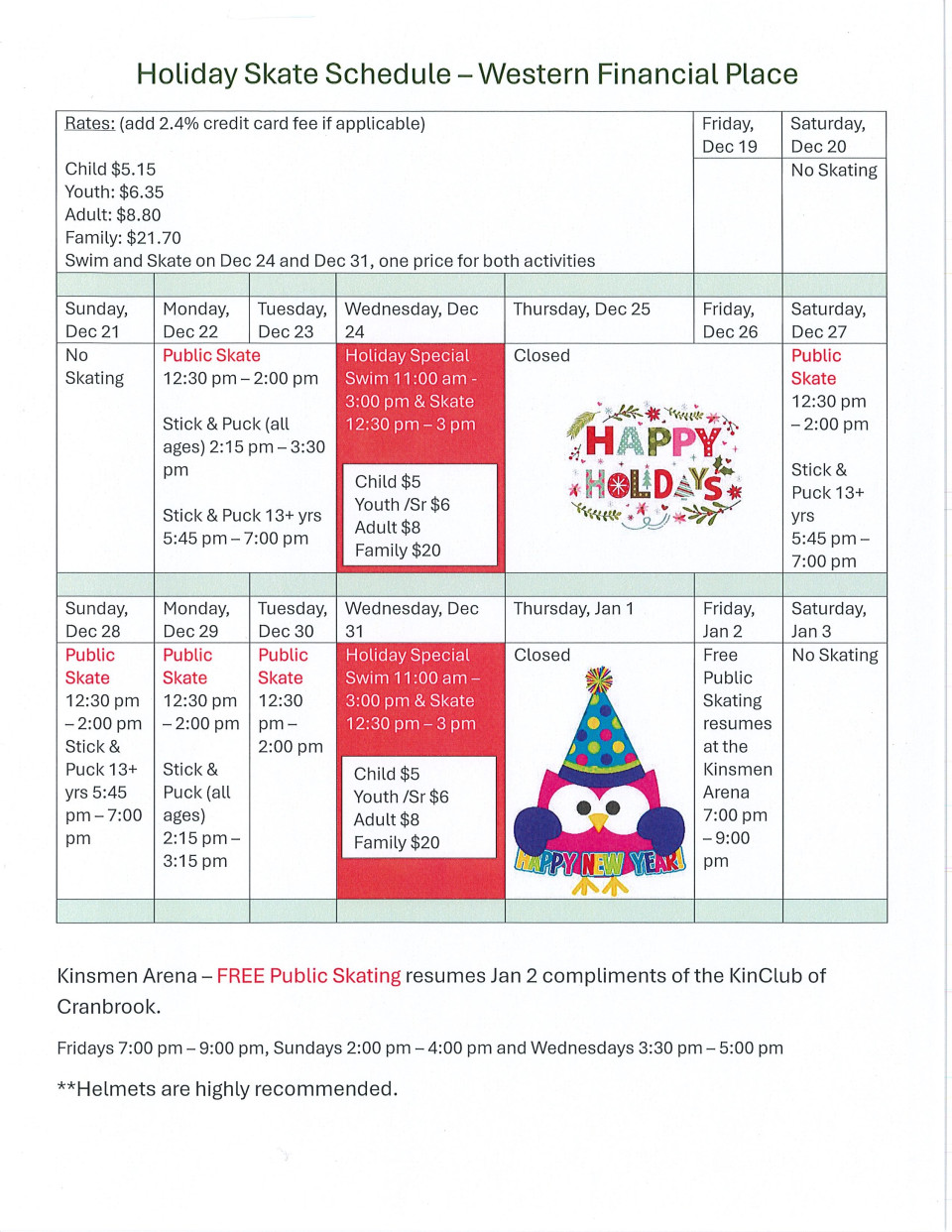 Free Public Skating will resume January 2nd. (compliments of Kin Club of Cranbrook)