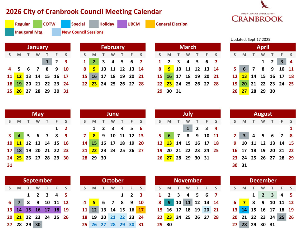 Meetings are held in Council Chambers at City Hall at 40 – 10th Avenue South and can be watched online at www.cranbrook.ca/livestream.