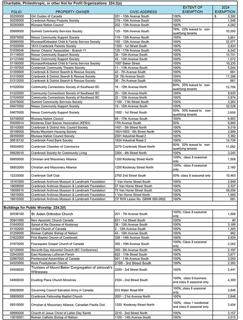 Following adoption of the City of Cranbrook Annual Taxation Exemption Bylaw No. 4217, 2025, the following properties were provided a permissive property Tax exemption by City Council for the year 2025, as per section 224(2)(a) and 224(2)(f) of the Community Charter.