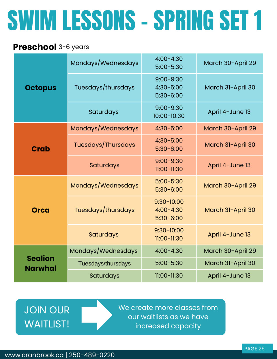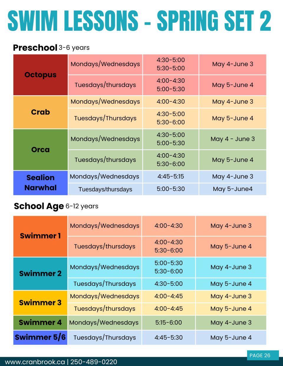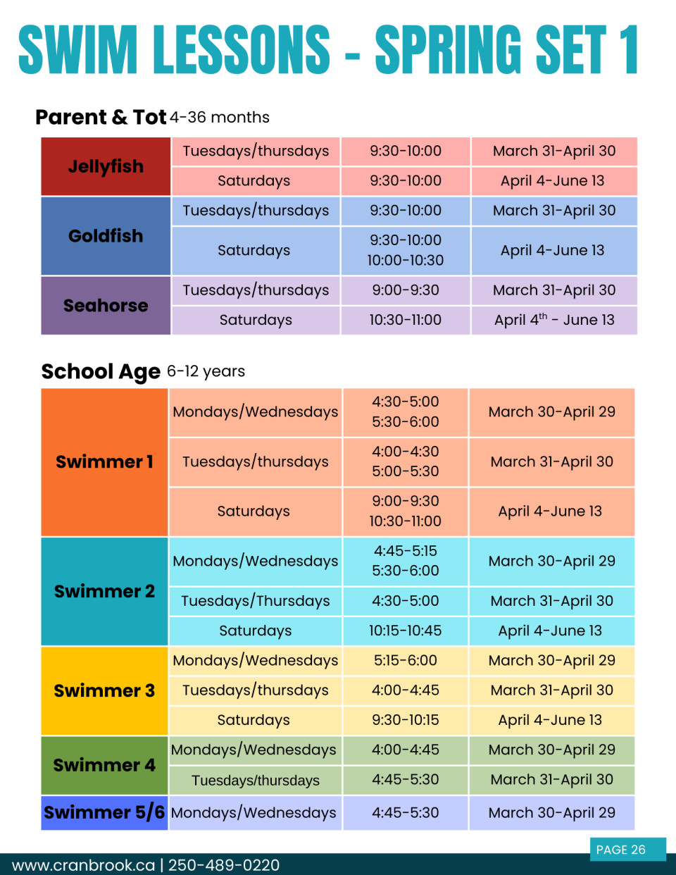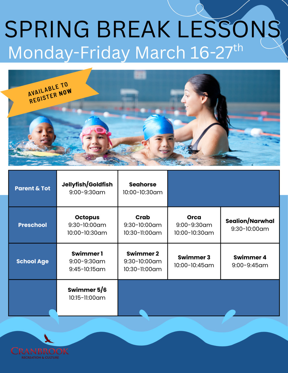 Mark your calendar! Spring Lessons will be available for registration on Tuesday, March 3rd, 2026 @ 9:00am MT. Keep an eye on this page for updates — exciting programs are just around the corner! You can register for swim lessons online here.